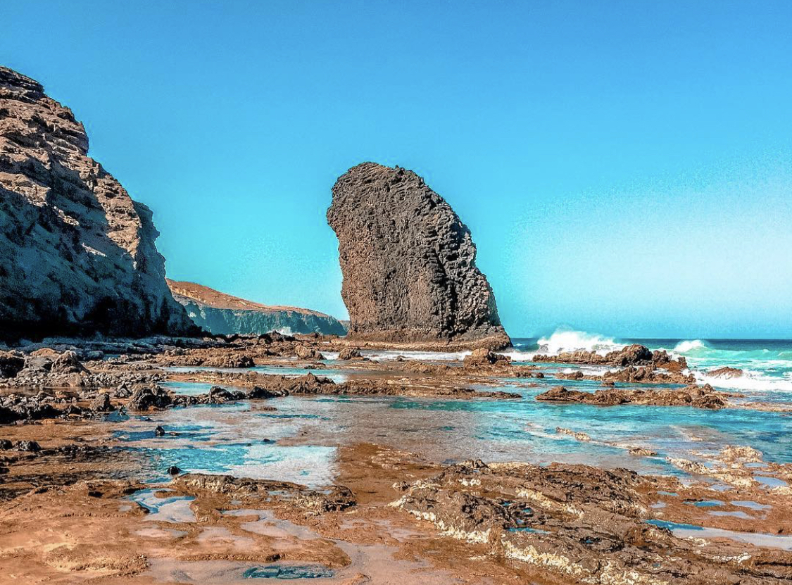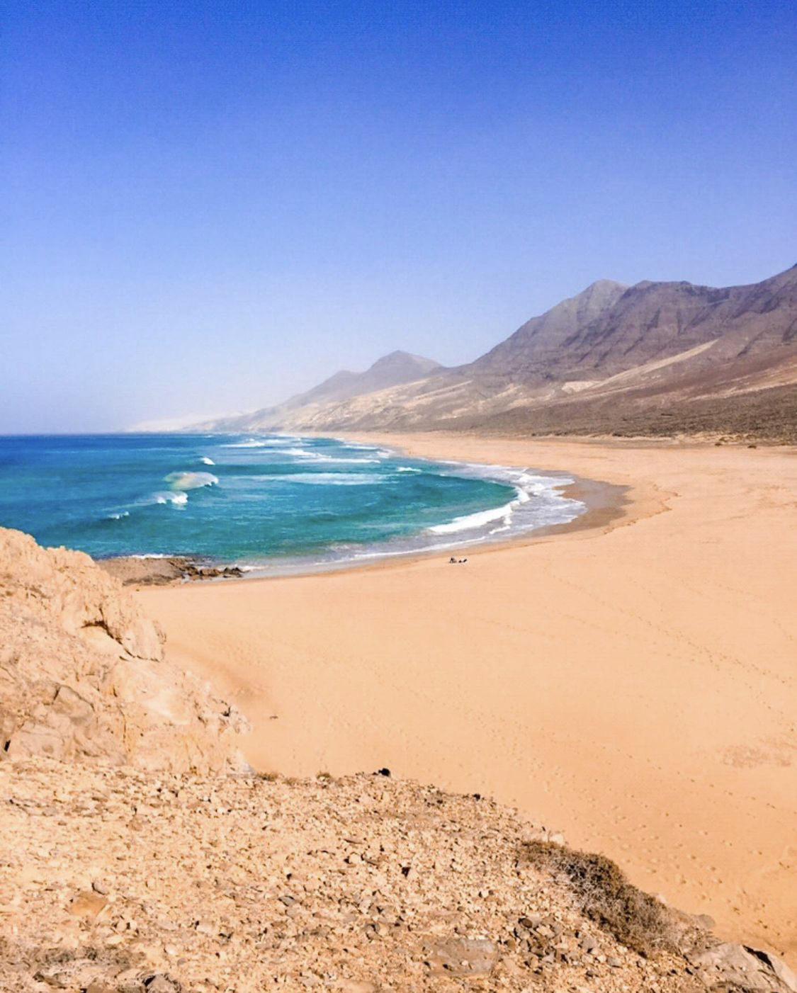 The main road leading south ends in Morro Jable’s port with ferries to Gran Canaria and Tenerife. This is where the more remote and “off-road” part of the Jandía peninsula begins and where you’ll also find Cofete, a small (yet popular) village on the wild western coast, famous for one of the most impressive beaches in Europe. If you’re into that, you’re at the right place. Before the port, take the right turn, direction Cofete, and keep going. Further down the road, you’ll see a sign pointing right towards Cofete, while the “main” (dirt) road will take you all the way south to the end of the island. You’ll find a small village Puerto de la Cruz there and a bit further also a lighthouse Faro Punta de Jandia. There are beaches along the Jandia coast, but be mindful of the sea state and the tide. Don’t enter the water unless you see people swimming there since the currents can be dangerous. If you decide to visit Cofete, take the right turn up to the mountains and make a photo stop at the highest point before the road starts descending to the other, western side. Before reaching Cofete, you can take a steep road down to the left (follow the sign: Roque del Moro and make sure your car will be able to make it) to see an impressive monolithic rock. You’ll already be able to see it nicely from the beach close to the parking; you can walk closer, but don’t try to reach it on foot in high tide and wavy seas. If you’re skipping Roque del Moro, keep driving straight to Cofete, park there and take a walk along the beach in both directions. Walking south, you’ll eventually reach the mentioned Roque del Moro, and walking north, you’ll come to El islote de las Siete Viudas, a small “kind of an island” that remains attached to the mainland (so, technically, a peninsula) that’s worth taking a look and a short walk. Regardless of how attractive the Cofete beach looks, don’t go swimming; the currents are invisible but strong and dangerous. Before learning about that, I went for a swim and then struggled pretty hard for at least 15 minutes to get out of the water that didn’t even reach my knees. It was terrifying and very eye-opening about how powerful the ocean can be. Instead of swimming, better have a coffee or lunch at the only restaurant there in Cofete; they offer good food and very efficient service.